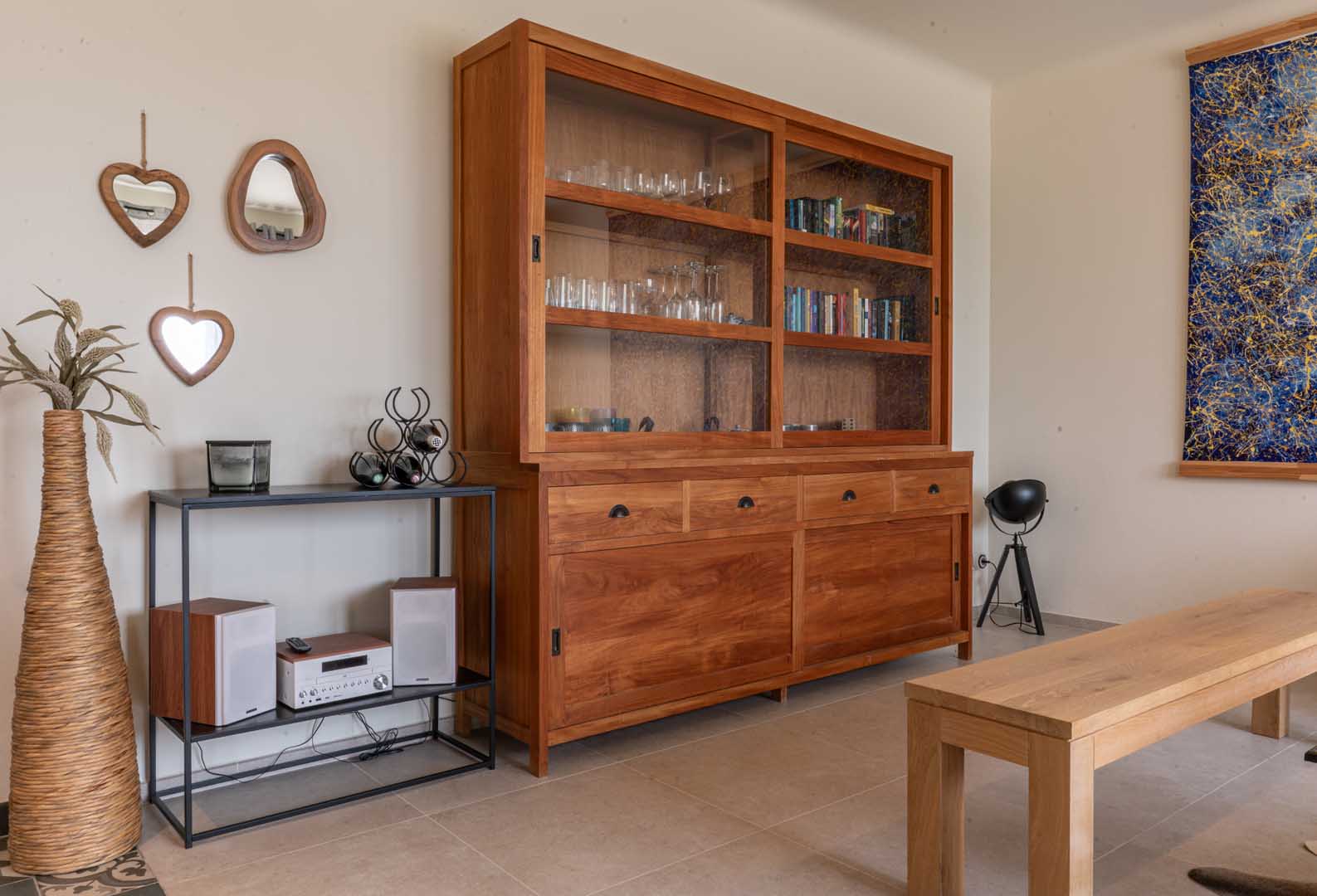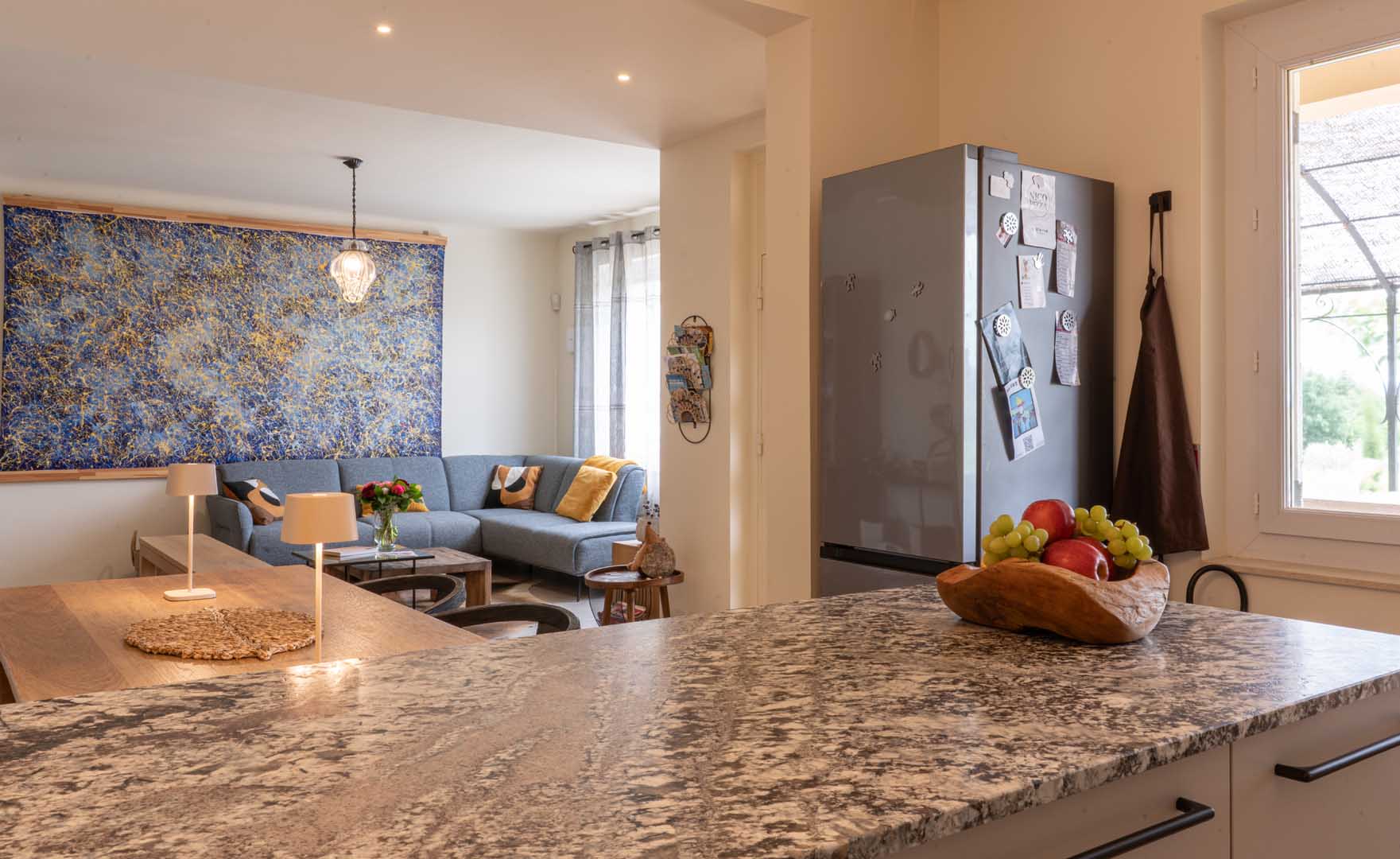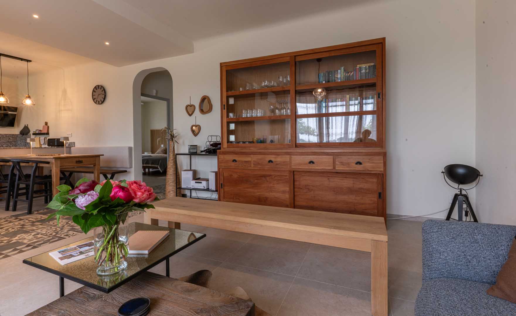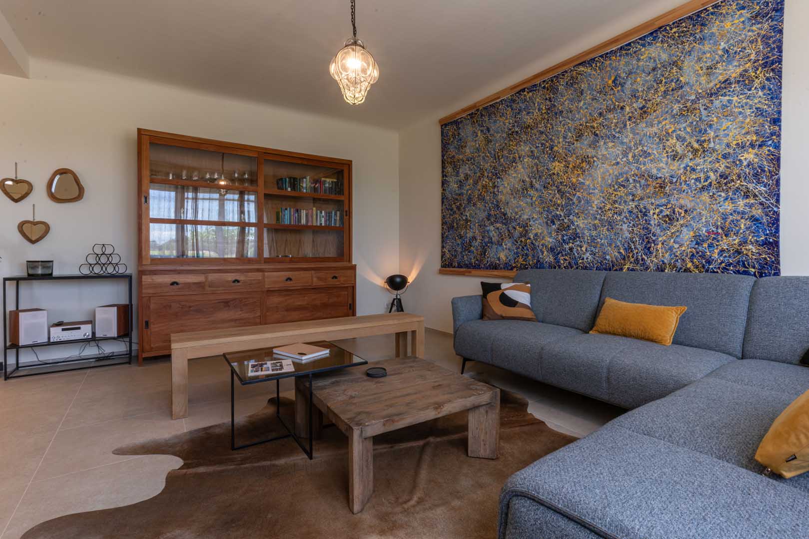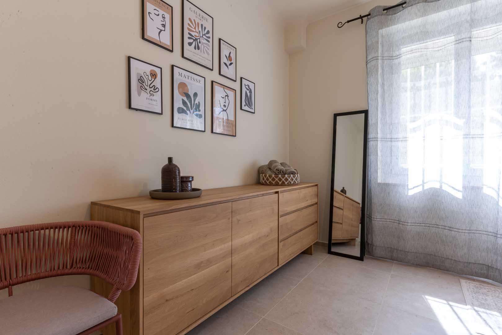 Outside, you can enjoy the view of the estate’s olive grove. From the indoor terrace, you are treated to an idyllic panorama, with views of Mont Ventoux and les Dentelles de Montmirail. Inside, the space exudes Fauvist vibes, thanks to the “Blue Nude” by the artist Matisse and a few posters. In the living room hangs an impressive canvas by a contemporary namesake: Ivanka.